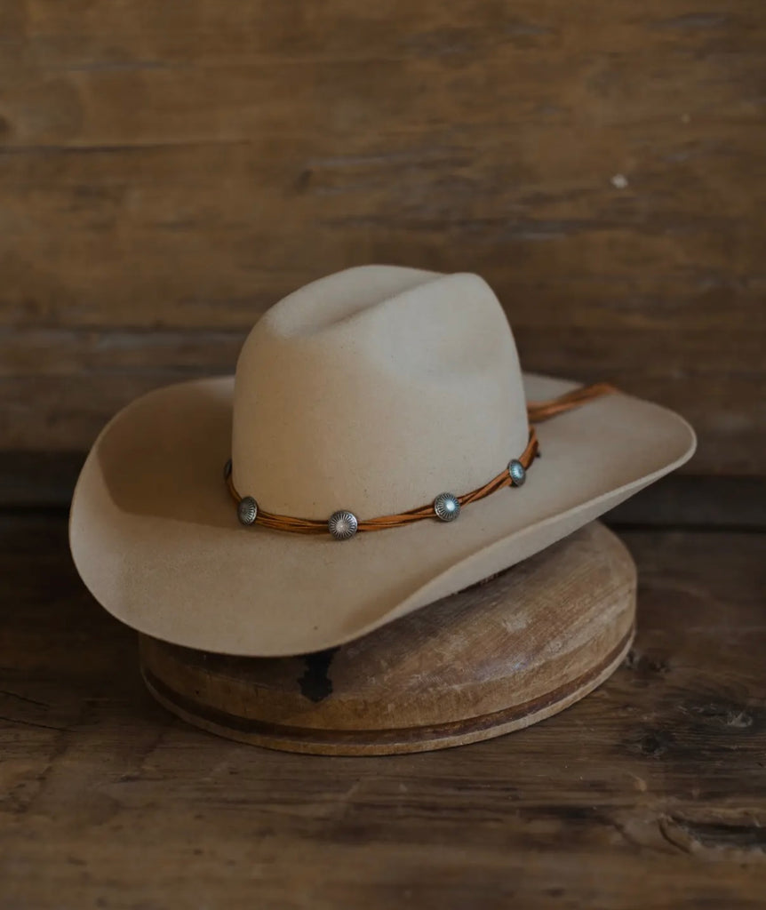 Four-strand wraps around hat and can be tied for adjustable closure. Conchos measure 5/8" in size. 8 conchos per band.
