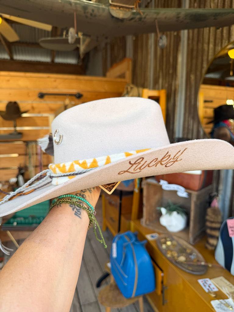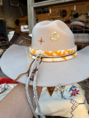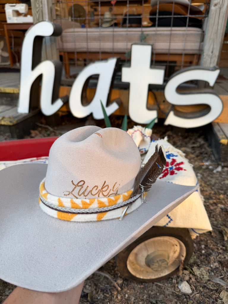 Feeling Lucky! This silver belly color cattleman has been laser engraved with lucky on the crown and the side of the brim. Hand made Pendleton hat band wrapped with braided grey suede and braided chocolate leather. A Turkey feather has been stitched in with two feather charms. We even added feather charms to the “tails” on the back and dangling from the back of the brim. Our signature stitching on the crown completes the braided leather that we wrapped in the same color.