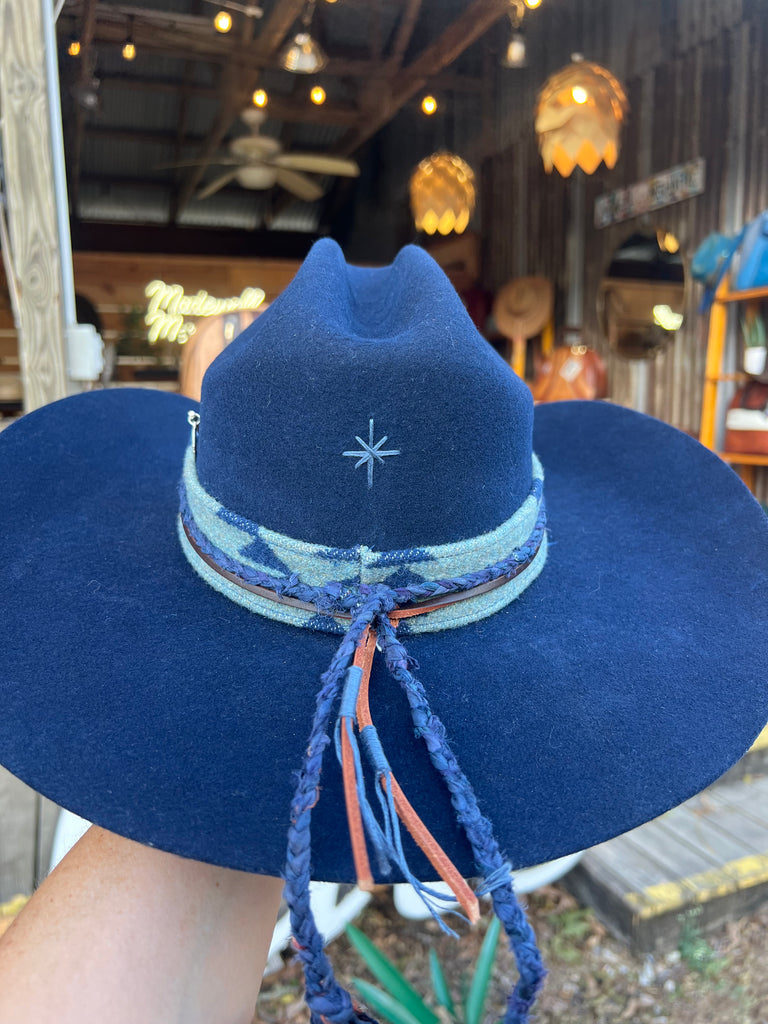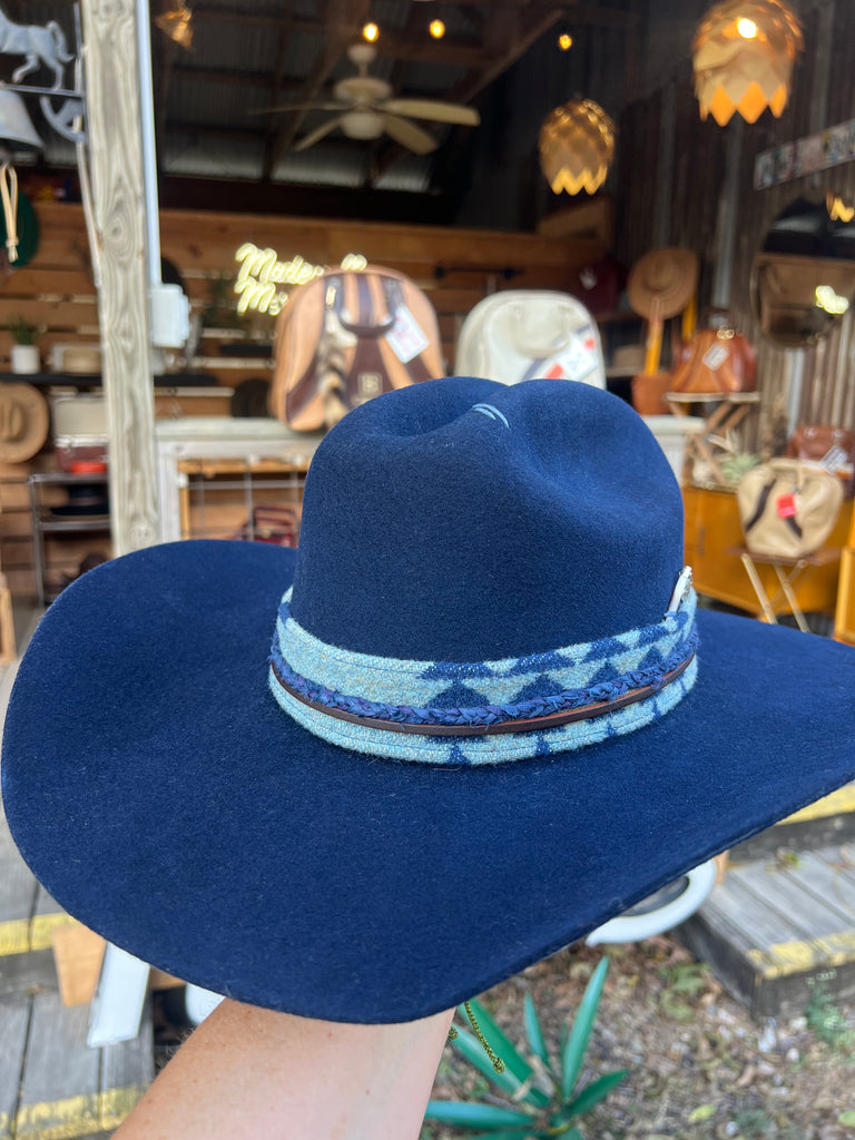 This is a gorgeous navy blue hat! I hand made the Pendleton hat band with blue hues to compliment the beautiful navy color of the hat. There’s a braided silk navy band made in our traditional “ tail style” with a dark chocolate leather band layered under it. The leather tails have been wrapped in the same color embroidery thread as our signature stitches on the crown. I also stitched in a porcupine quill with a Thunderbird charm. One of a kind gorgeous hat!